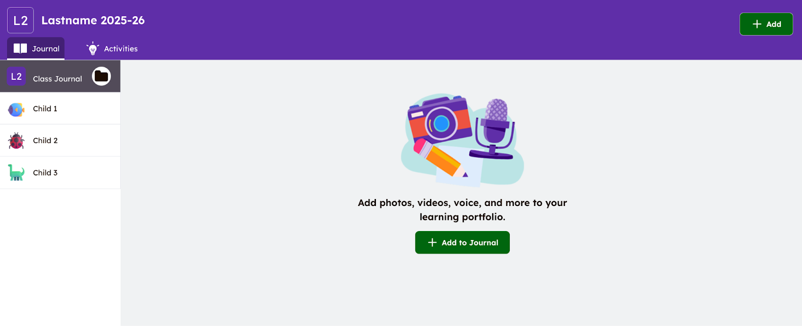 - You will see your children listed down the left hand side under Class Journal