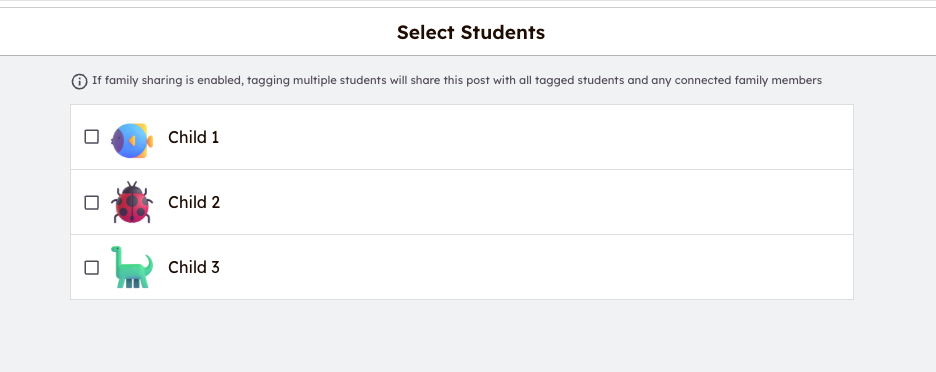 If you click on 'Child 1', you will see all submissions posted for Child 1 listed from newest to oldest. This will include any posts that were 'tagged' with other children in the family.
