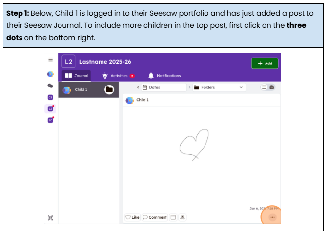 Watch the video Edit People on a Post.mp4 and/or follow the instructions below to see how easy it is to add all your children to a post from one child’s Seesaw account.