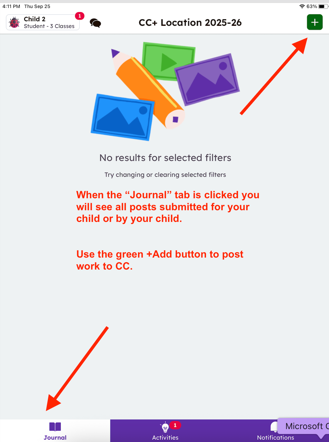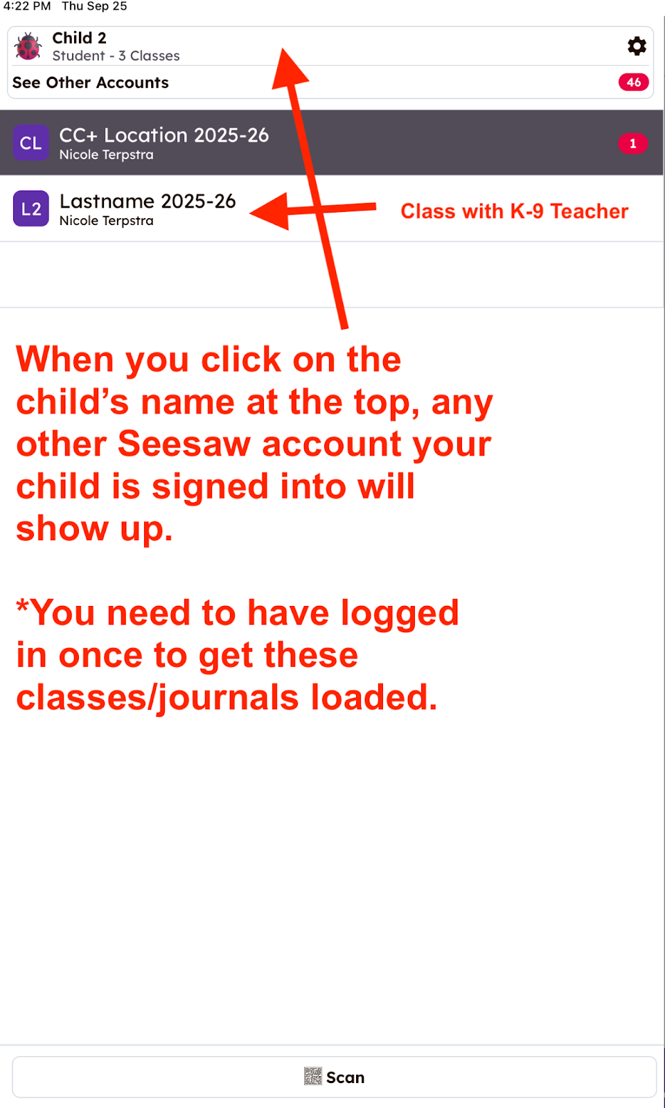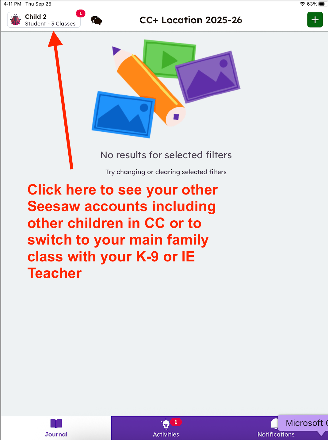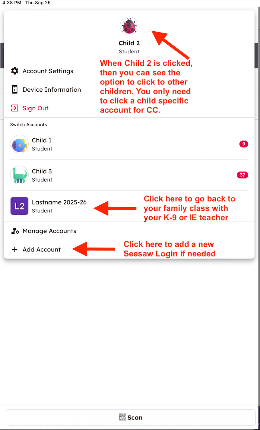 Watch this Seesaw video to help see how to add accounts and switch between each child’s CC/CC+ class and your family class: How Can Users Switch Between Seesaw Accounts