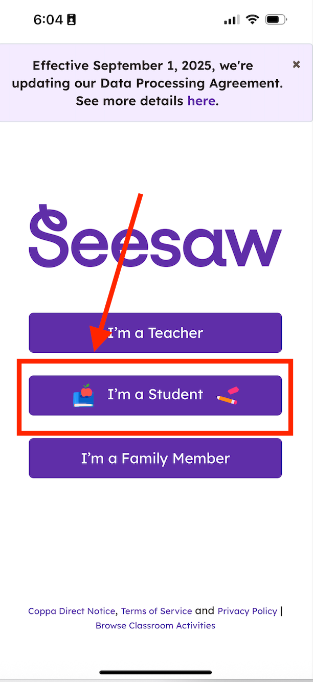 - When you click on 'I'm a Student', a student login page will open in the Seesaw App