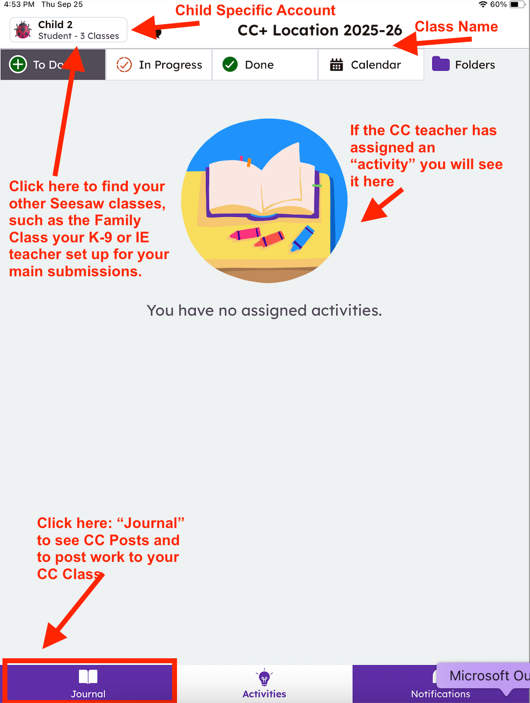 - using either option, Seesaw will open to a unique page for your child in the CC/CC+ Seesaw Class Journal