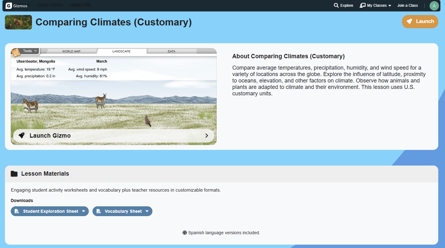 Selecting the “Lesson info” button opens a definition of the Gizmo, a student exploration sheet, and a vocabulary sheet. Students can type directly into the exploration sheet document by saving the file to their computer and then typing in either Microsoft Word or Google Docs. Vocabulary sheets are also available for student use. The example below is also available in Spanish.