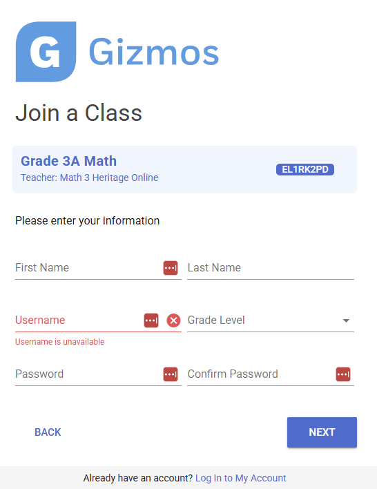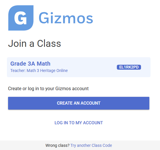 4. Choose the blue bar “Create an Account.” If you already have an account, choose the “Log in to My Account” button. You can also choose to use a different code at this point by choosing the “Wrong Class? Try another class code” button.