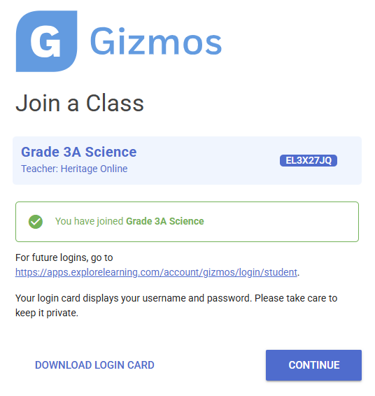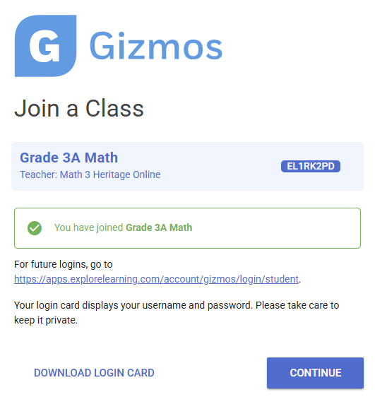 6. You will see the confirmation that you have signed up for the class. Please bookmark the login link: https://apps.explorelearning.com/account/gizmos/login/student